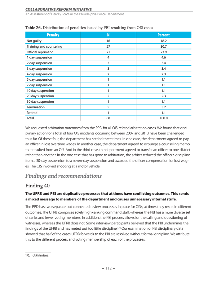 Out of 88 officers who were found to have violated department policy during a shooting incident, 73 percent were not suspended or terminated. Some interviewees told the Justice Department they believed that the department's board of inquiry undermined findings from internal reviews of officer shootings, resulting in "too little discipline."