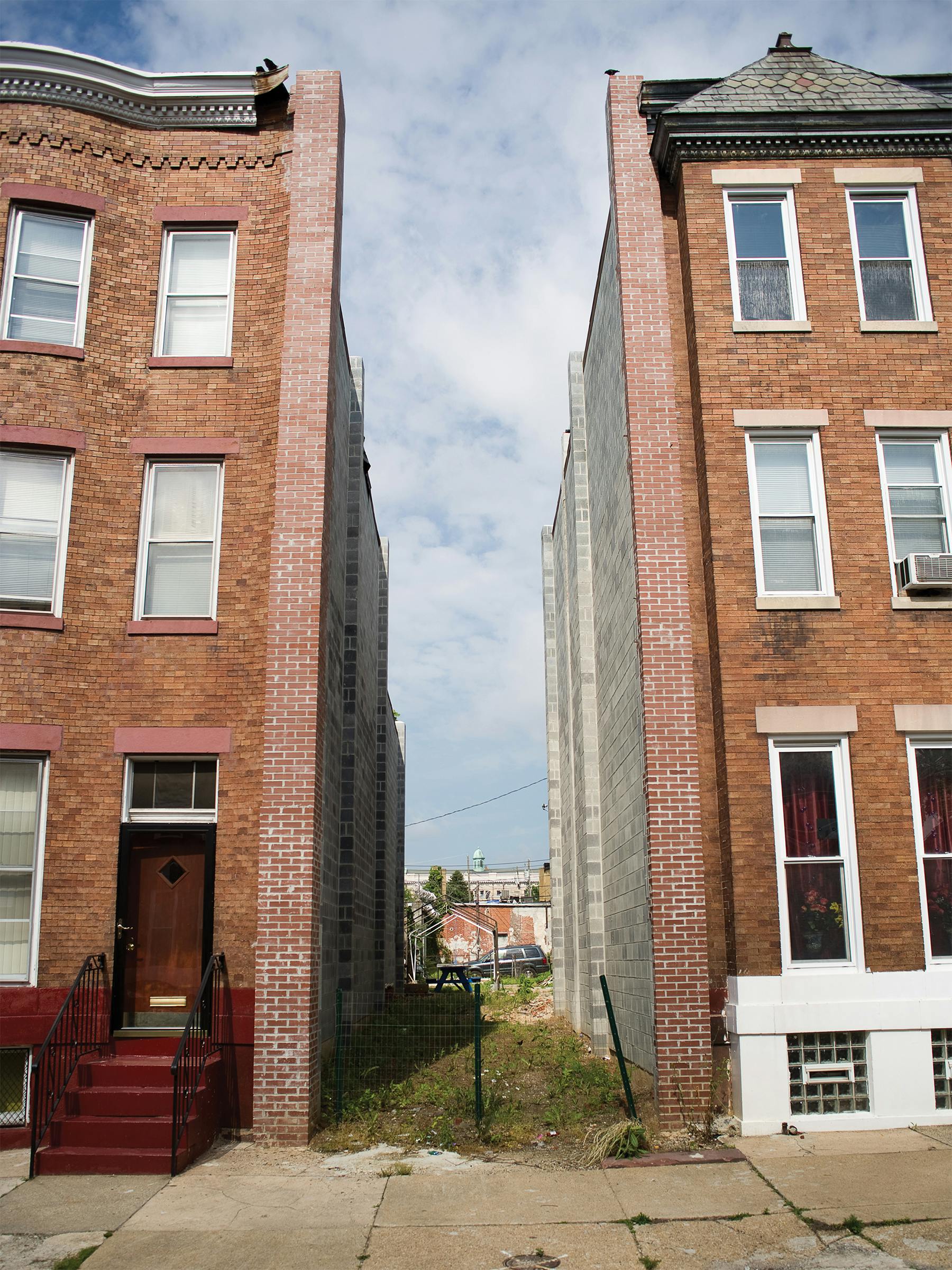 But even as Mitchell and his brother spackled walls and patched leaks, 1906 Boone sat vacant—a moldering eyesore that dragged the entire neighborhood down with it. Whenever it rained, water would collect in the abandoned row house and seep into Mitchell’s basement. To discourage break-ins, he hung his mother’s curtains in the upstairs windows at 1906. But with no one tending to it, the house eventually collapsed in on itself. When I visited the property, it looked like a stage set for an apocalypse film, its walls and floors partially demolished, its roof open to the sky. Bird droppings covered the stairwell. The bathtub was still there. Exposed, squatting precariously on a jagged scrap of what used to be the second floor, the tub felt somehow obscene: a ruin-porn image of a city in crisis.